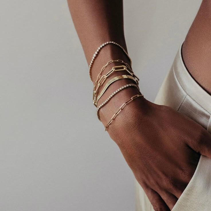 Jedes Stück entstoot im Stillle wird mit de Hand gformt mit Sinn und Anmut. Usgfestem Edelstahl gmacht und mit 18 Karat Gold überzoge isch jedes Design wasserdiicht und anlaugbeständig gmacht zum sini ruigi Schiins Jahr für Jahr z behalte.